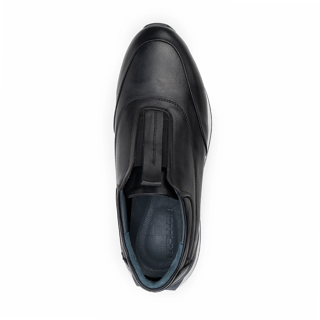 کفش چرم ونس باراد مردانه، مشکی، از چرم طبیعی گاوی ناپا با طراحی بدون بند، کفی طبی و زیره مقاوم. شیک، راحت و مناسب استفاده روزمره و استایل نیمه‌رسمی.
